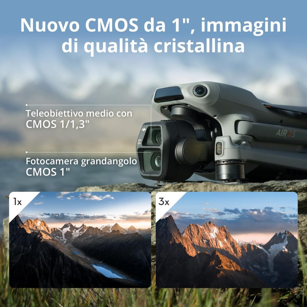 Il DJI AIR 3S è equipaggiato con una doppia fotocamera che offre un’ampia gamma di opzioni creative per i videomaker e i fotografi. Il sensore grandangolare da 1 pollice è in grado di catturare dettagli sorprendenti, mentre l’obiettivo 24 mm con apertura f/1.8 è ideale per situazioni di scarsa illuminazione e per ottenere effetti di profondità di campo. Allo stesso modo, l’obiettivo 70 mm con apertura f/2.8 è perfetto per soggetti a distanza, permettendo di isolare il soggetto dallo sfondo e di ottenere immagini nitide e dettagliate.