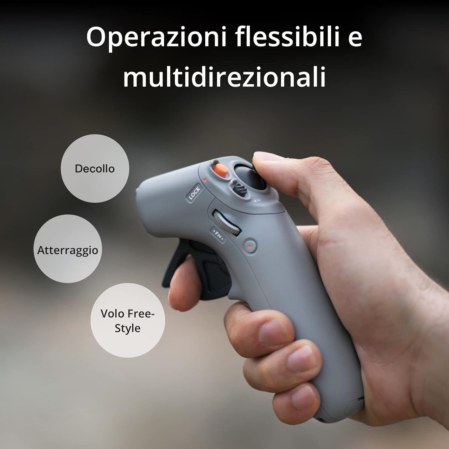 Un altro aspetto che pensavamo potesse causare confusione è stato il posizionamento del pulsante anti panico o Stop, spostato dal lato destro (dove è facilmente accessibile) al sinistro. Tuttavia, si tratta di un problema trascurabile, poiché riportando il RC Motion 2 in posizione neutra o verticale si rilascia il grilletto del throttle (acceleratore), facendo fermare il drone in modo piuttosto rapido. Il piccolo pulsante arancione è utile anche per mantenere una posizione stabile in hovering del DJI Avata, mentre la mano destra controlla il Motion 2 per altre operazioni.